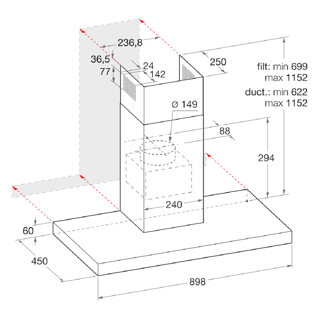 أريستون شفاط مدمج على شكل حرف T، 90 سنتيمتر، AHBS 9.3F LL X - فضي المواصفات: