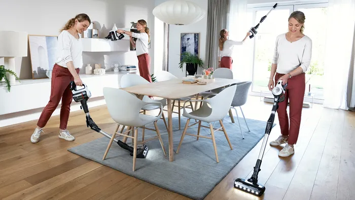وفر الوقت والطاقة بفضل وظيفة الحامل السريع. قم بالتبديل بسهولة ودون عناء من تنظيف الأرضيات بالمكنسة الكهربائية إلى التنظيف في المنتصف باستخدام المكنسة الكهربائية اليدوية. أثناء التنظيف بالجهاز اليدوي، تقف الفوهة والأنبوب بمفردهما ببساطة. لا داعي لوضع المكنسة الكهربائية على الأرض أو إعادتها إلى محطة الإرساء. بعد ذلك، ما عليك سوى إعادة الجهاز اليدوي إلى الأنبوب ومتابعة تنظيف الأرضية.
