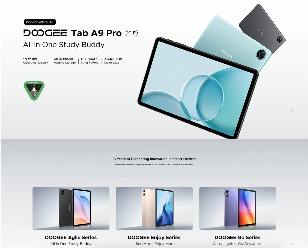 نظرة عامة على دوجي تاب A9 برو، سعة تخزين 128 جيجابايت، وذاكرة وصول عشوائي 20 جيجابايت، وشاشة IPS LCD عالية الدقة مقاس 10.1 بوصة.