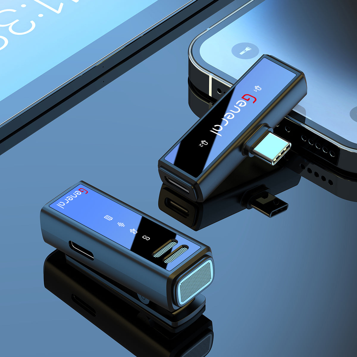 الحزمة الكاملة - تتضمن 2 ميكروفون لاسلكي، 1 جهاز استقبال من النوع C، 1 حافظة شحن، كابل USB-C ودليل.