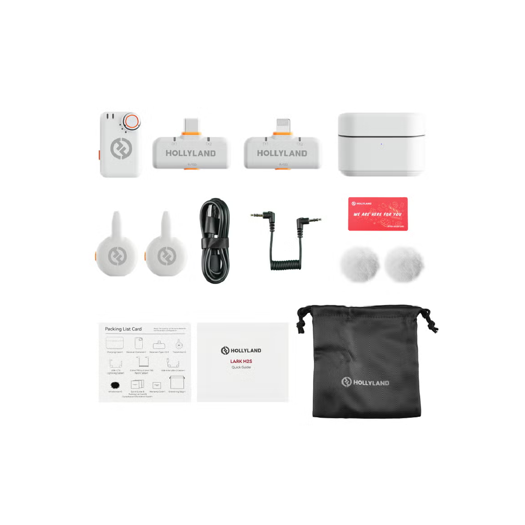 سجّل ما يصل إلى شخصين في تطبيقات الصحافة المحمولة أو إنشاء المحتوى باستخدام نظام الميكروفون اللاسلكي LARK M2S التميت كومبو من هولي لاند. يتضمن النظام جهازي إرسال فائقي الصغر مزودين بميكروفونات مدمجة متعددة الاتجاهات للتسجيل الدقيق، ومستقبلات USB-C ولايتنج للتوصيل المباشر بالأجهزة المحمولة، وجهاز استقبال مثبت على الكاميرا، وحافظة شحن. يتميز جهازا الإرسال بتصميم من التيتانيوم سهل التركيب لتثبيتهما بإحكام على جهازك، ولا يحملان شعارات ظاهرة لمظهر بسيط.
