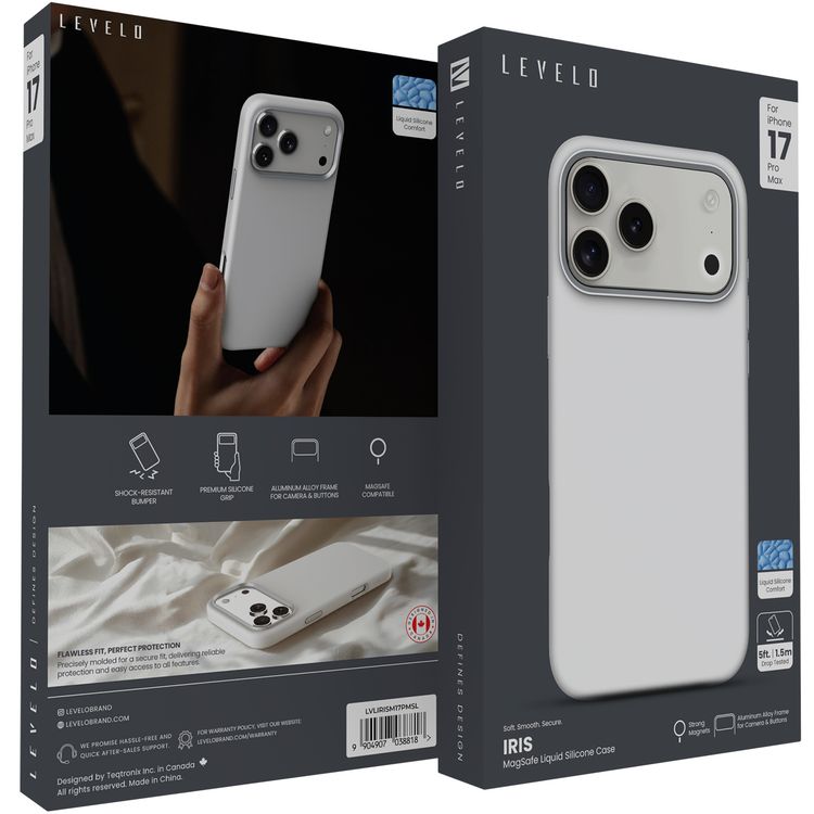 يتميز غطاء السيليكون السائل ليفيللو ميا ماجسيف باللون الفضي لهاتف أيفون 17 برو ماكس بمظهر أنيق وحماية فائقة. يضمن إطاره المصنوع من سبائك الألومنيوم مظهرًا رائعًا ومتانة عالية. كما أنه يحمي الكاميرا والأزرار.