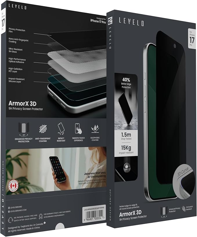 حماية الشاشة ليفيللو ارمور أكس 3 D 9H منتجٌ فاخرٌ مصممٌ خصيصًا لحماية جهازك وخصوصيته. بفضل زجاجه فائق المقاومة 9 H وشهادة اختبار السقوط من ارتفاع 1.5 متر، يحمي واقي الشاشة شاشة جهازك من الصدمات والخدوش. توفر طبقة PET عالية الدقة وضوحًا فائقًا، بينما تمنع طبقاته المقاومة للزيوت والمضادة لبصمات الأصابع النانوية اللطخات وبصمات الأصابع من تشويه شاشتك. يحافظ الواقي على ملمس ناعم وتفاعل سلس مع الشاشة. يسمح لك غشاء حماية الخصوصية بحماية بياناتك من أي شخص يحاول عرض جهازك في الأماكن العامة. يتميز الواقي بحماية أفضل للحواف بنسبة 40%، مما يجعله أكثر متانة حول الزوايا. كما يستخدم واقي الشاشة ليفيللو ارمور أكس 3 D 9H سيليكونًا مقاومًا للصدمات مع لاصقات بصرية عالية الأداء لضمان تثبيت آمن وخالٍ من الفقاعات. صُنع الواقي من نفس المواد لحماية الجهاز من الاستخدام اليومي.