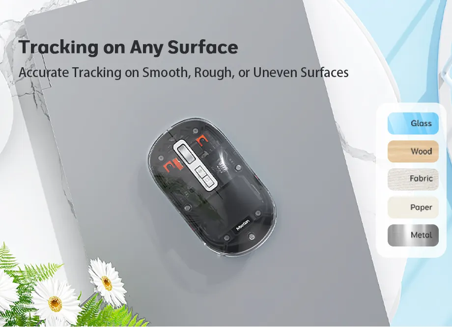 يضمن الماوس BTM005 أداء تتبع دقيقًا على مختلف الأسطح، سواء كانت ناعمة أو خشنة أو غير مستوية. استمتع بحركة مؤشر ثابتة وموثوقة دون انقطاع، أينما كنت. تتيح لك هذه المرونة استخدام الماوس في بيئات متنوعة، سواء كنت تعمل في المنزل على مكتب خشبي أو أثناء التنقل على أسطح غير مستوية. تمتع بتجربة تنقل سلسة بلا حدود.