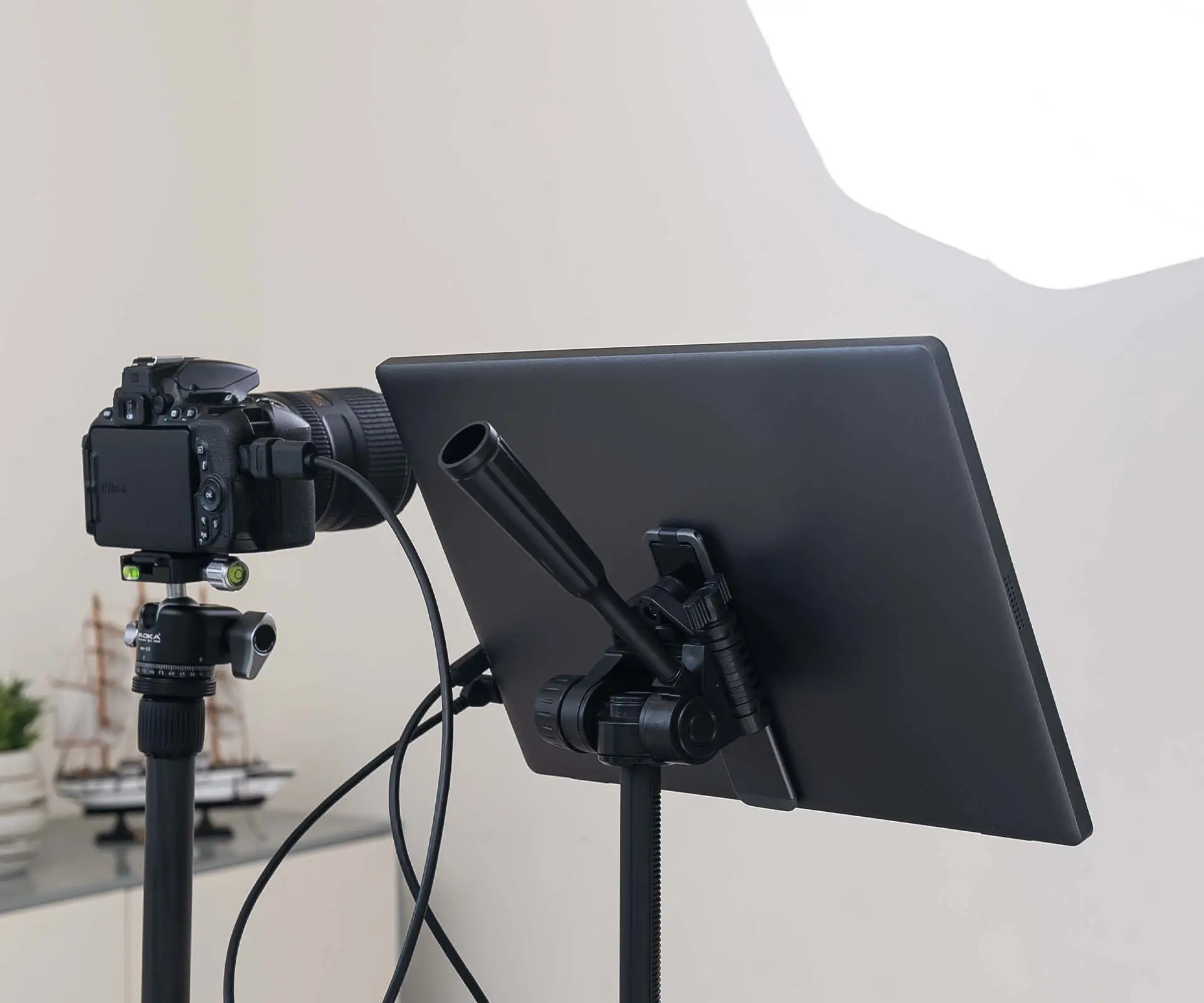 قم بتوصيل الشاشة المحمولة بمقبس الحامل ثلاثي القوائم مقاس 1/4 بوصة لتعزيز مرونتها ولتوفير وضع مريح بجانبك.