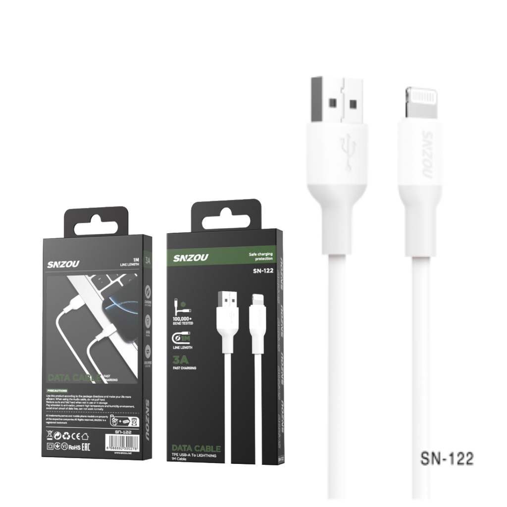 سينزو SN-122 كابل شحن سريع 3A USB-A إلى لايتنج بطول 1 متر - أبيض المواصفات: