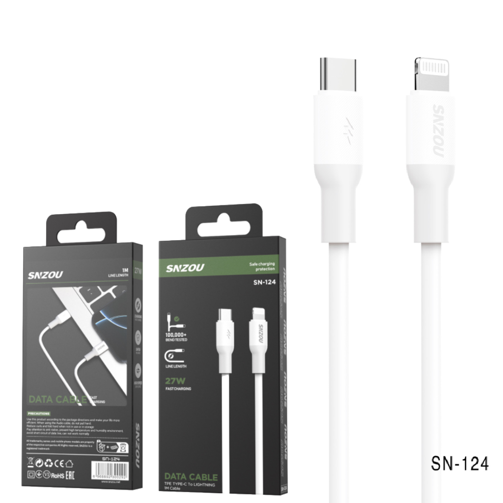 سينزو SN-124 كابل شحن سريع 27 واط تايب-سي الي لايتنج بطول 1 متر - أبيض المواصفات: