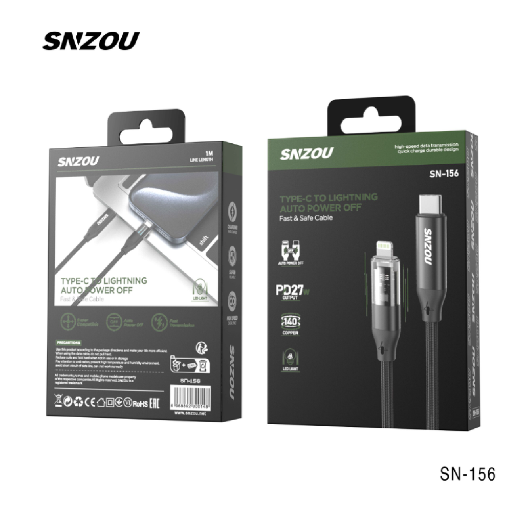 سنزو SN-156 كابل من النوع C إلى لايتينج بقوة 27 واط مع خاصية الإيقاف التلقائي السريع والآمن - أسود المواصفات: