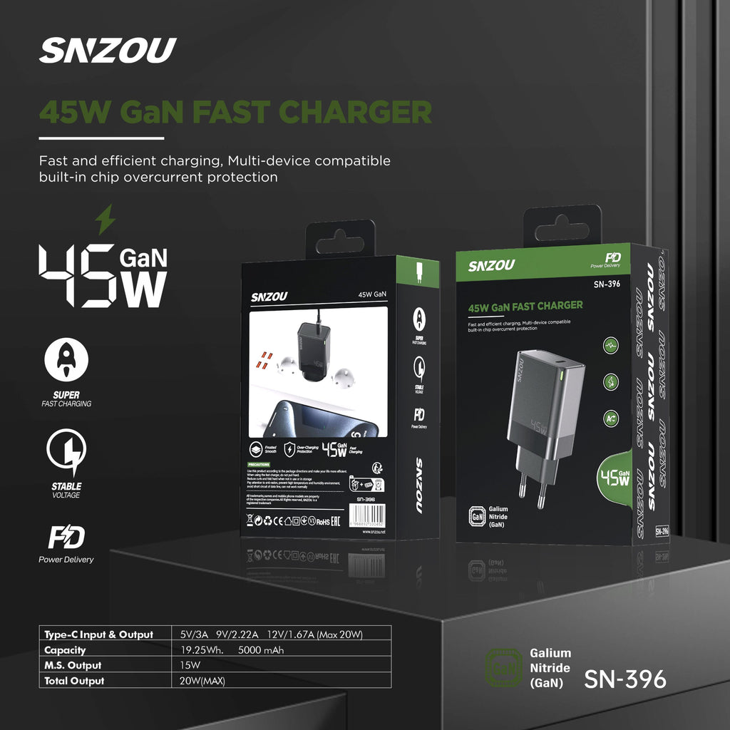 سينزو SN-396 باور كور شاحن 45 واط GaN متعدد الأجهزة - أسود المواصفات: