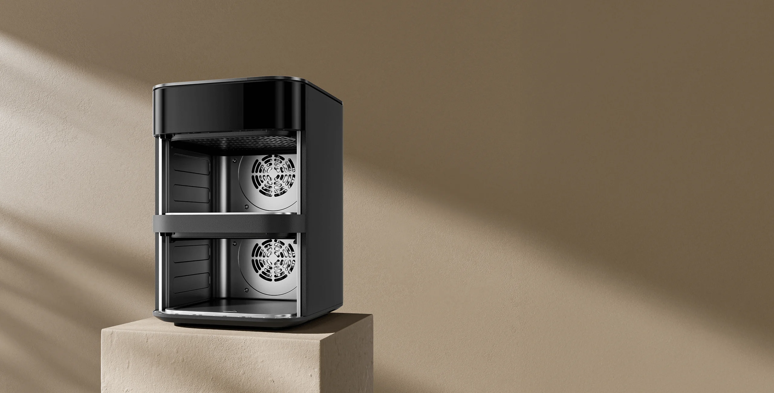 يُعدّ وضع سلتين فوق بعضهما عموديًا أكثر توفيرًا للمساحة من وضعهما جنبًا إلى جنب. توفر المقلاة الهوائية حوالي 35% من المساحة الأفقية مقارنةً بمقلاة شاومي الهوائية ثنائية المنطقة سعة 10 لترات.