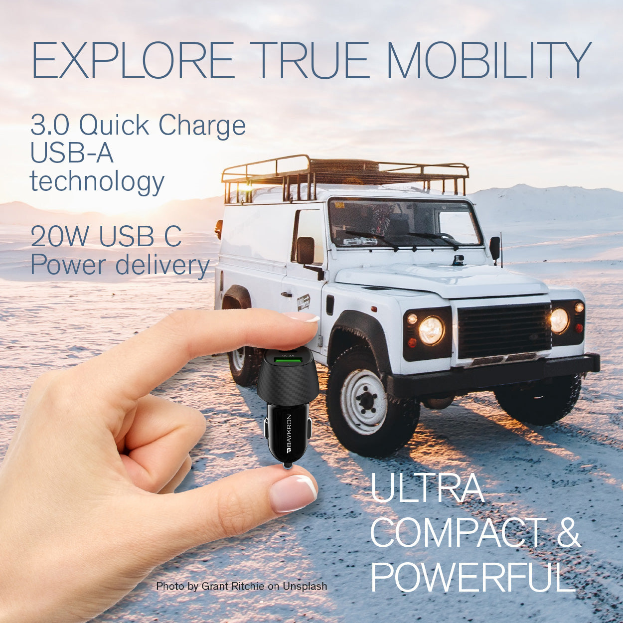 The BAYKRON 36W Smart Car Charger simultaneously charges two devices from one 12 volt outlet with two charging ports including one Qualcomm Quick Charge™ (QC3.0) port and one USB Type-C™ Power Delivery 20W.