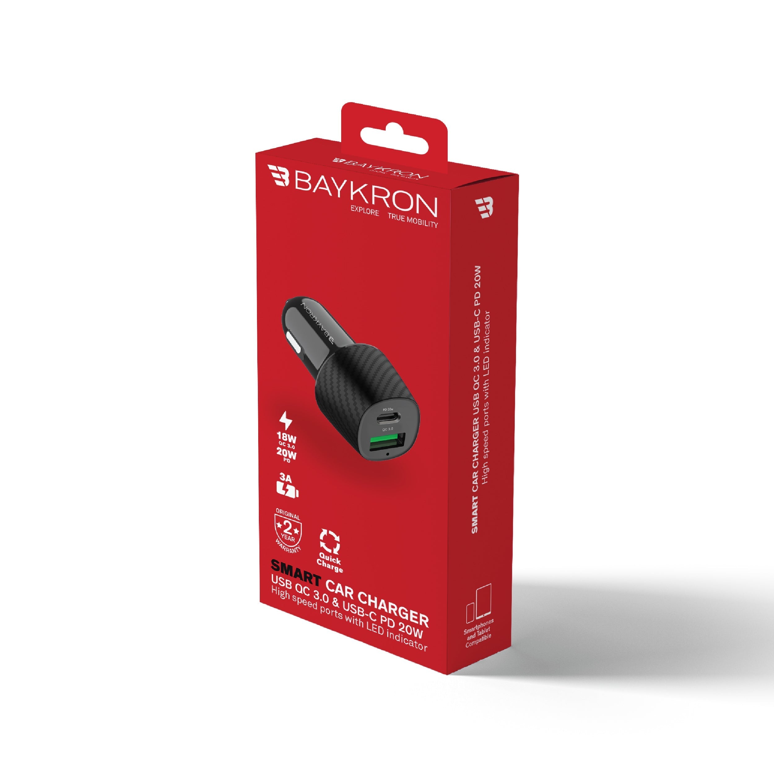 BayKron Premium Car Charger USB QC 3.0 - USB-C PD 20w - Black Spec: