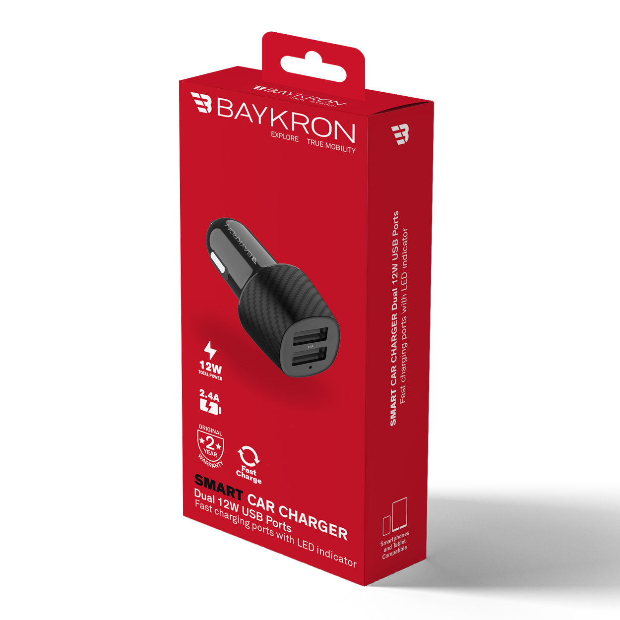 BayKron Smart Car Charger Dual USB Ports 12W - Fast Charging Ports With LED Indicator - Black Spec: