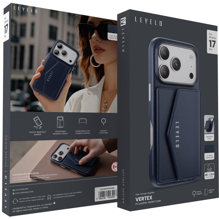 Levelo Case For iPhone 17 Pro Full-Wrap Leather, Detachable Wallet - Blue Spec: