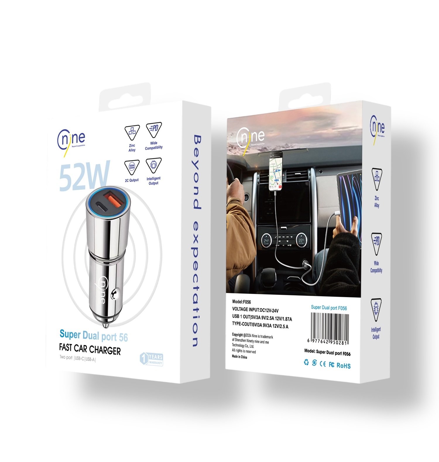 Features | Enjoy fast and efficient charging for your devices on the go with the Nine Ultra-Fast Dual-Port Car Charger. Featuring a sleek, modern design and a durable zinc alloy body, this charger is the perfect addition to your vehicle. |