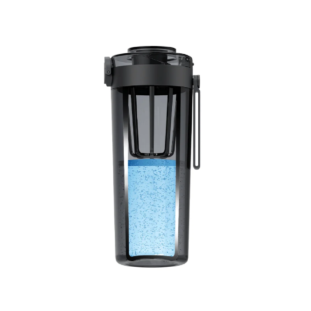 The tea strainer is embedded in the upper lid, but won't interfere when water is added to fruit or a tea bag in the bottle. The tea strainer filters tea leaves or fruit residue to deliver pure drinking joy.